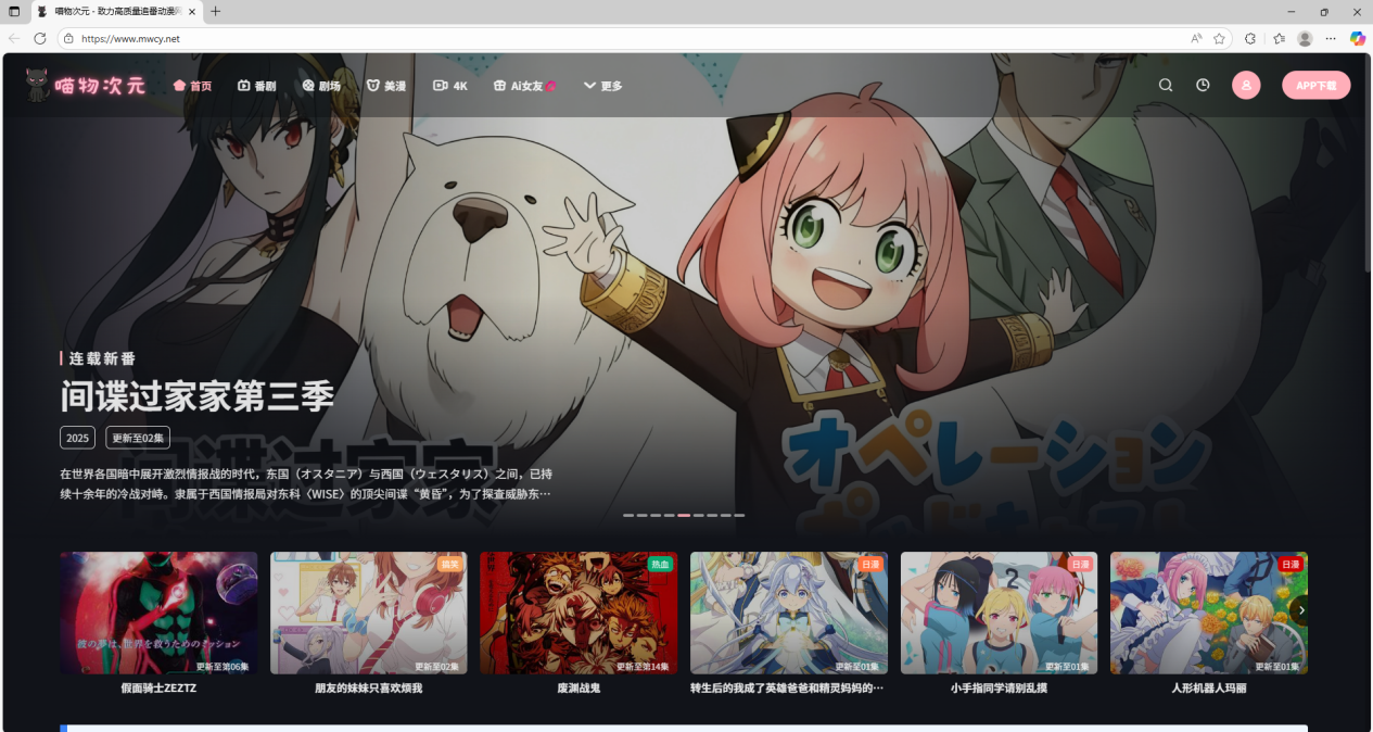 3、喵物次元这是一个可以在线免费观看各种高清动漫的网站,里面包含了超级多的高品质的动漫作品,几乎包含了你能想到的所有热门番剧,其中包括了日本动漫、动漫电影、欧美动漫等各种类型,像海贼王,进击的巨人,鬼灭之刃这些热门新番和经典老番都能在这儿找到高清资源,网站更新非常及时。