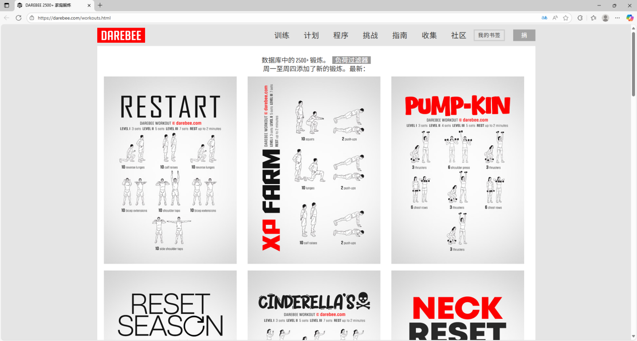 5、darebee这是一个完全免费的健身资源网站,里面有超2000种的健身动作,并且做了详细的分类。只要选择好强度,或者选择器械类型就可以看到详细的pdf或者是视频,可以在线查看或者直接下载使用,也可以在上面直接制定训练计划,然后直接打卡训练,并且还有对应的饮食计划和食谱,不管你是想健身还是想减肥,都可以找到自己想要的内容。