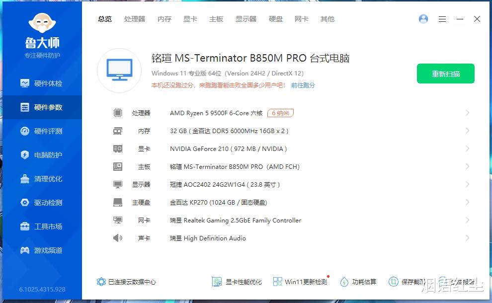 先给大家看一下我刚刚攒的电脑的详细配置,CPU是AMD锐龙5 9500F,6核12线程,最高睿频高达5.0GHz,内存为金百达DDR5 6000MHz 16GB*2内存,硬盘为金百达KP270 SSD固态硬盘。