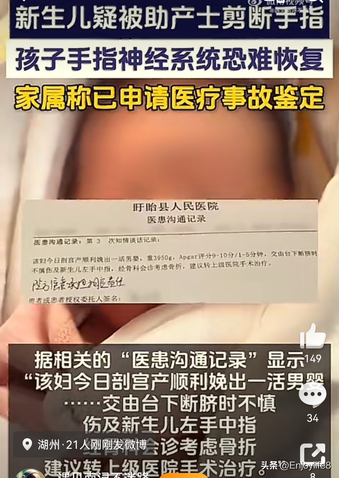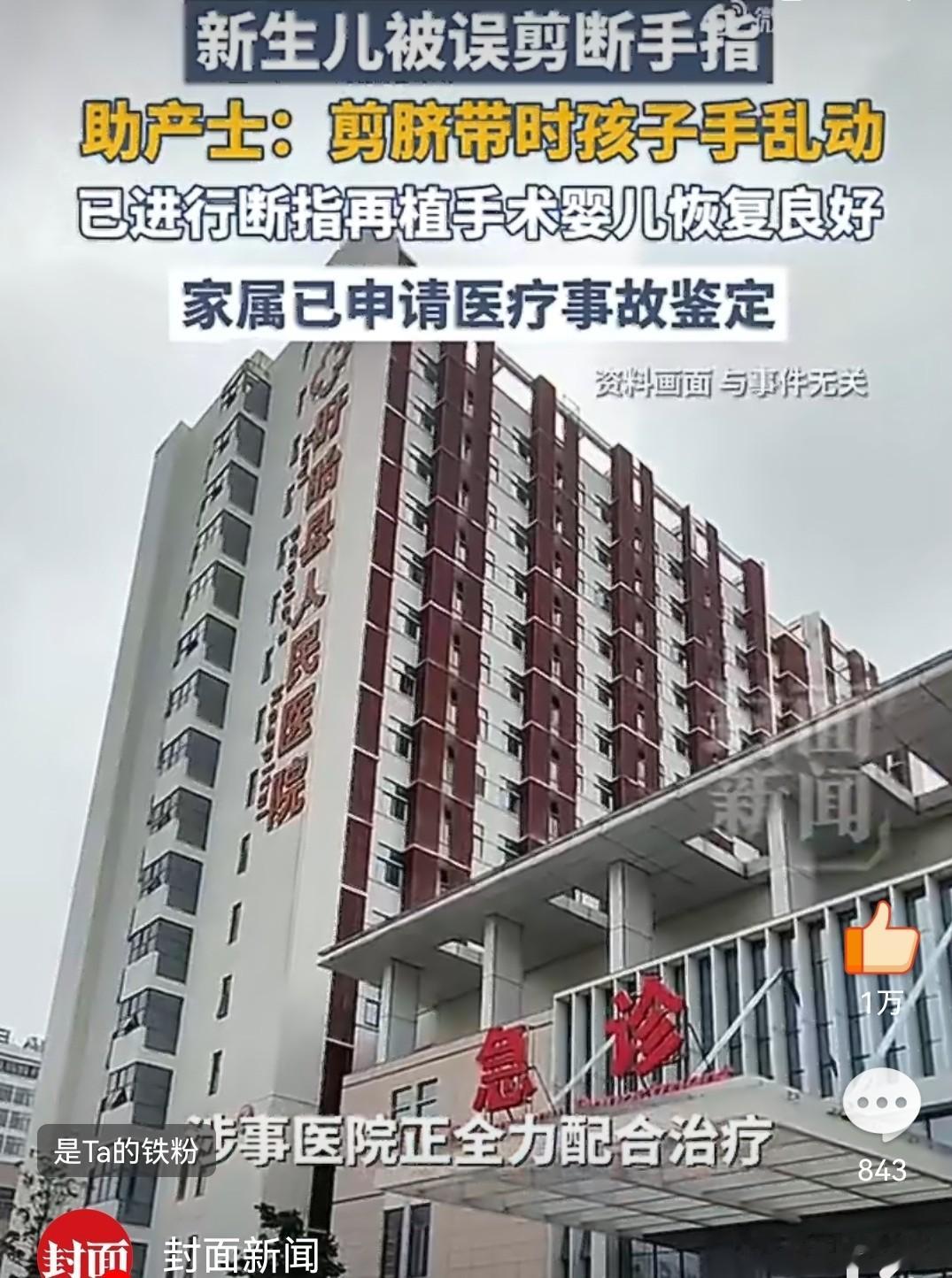 “医院承担了前期的医疗费用,并不等于不该承担其他责任。”评论强调,新生儿手指被剪断,即使目前显示“已治愈”,也不等于事件就不值得反思。