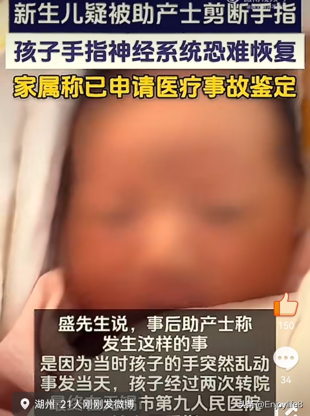 然而,12时左右,医生带来的消息犹如晴天霹雳:助产士在剪脐带时,不慎用脐带剪剪断了新生儿左手中指。据盛先生描述,他看到孩子时,手指“只剩皮连着”。