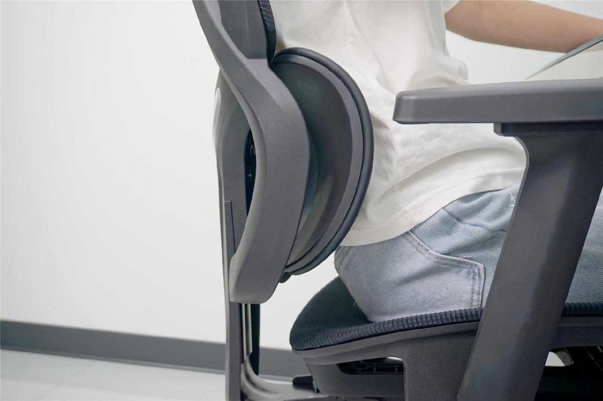 Gesture的护腰思路偏整体随动,而不是单点“顶腰”。它采用的是3D LiveBack靠背结构,内部有类似空气柱的弹性系统,人在坐下、前倾、后仰时,靠背会跟着脊柱形态发生形变,让背部始终贴着椅背。腰部支撑不会突然给你一个很硬的推力,而是持续存在、比较柔和的托着,对长时间正坐办公来说比较友好。不过它对骶骨的托举力度不算强,如果你是那种特别需要“硬撑腰”的人,可能会觉得它偏温和。
