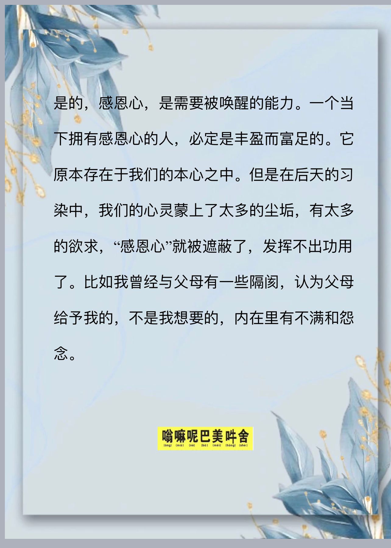 一个当下拥有感恩心的人,必定是丰盈而富足的。它原本存在于我们的本心之中。但是在后天的习染中,我们的心灵蒙上了太多的尘垢,