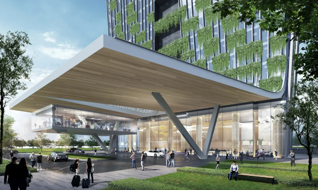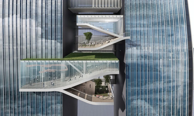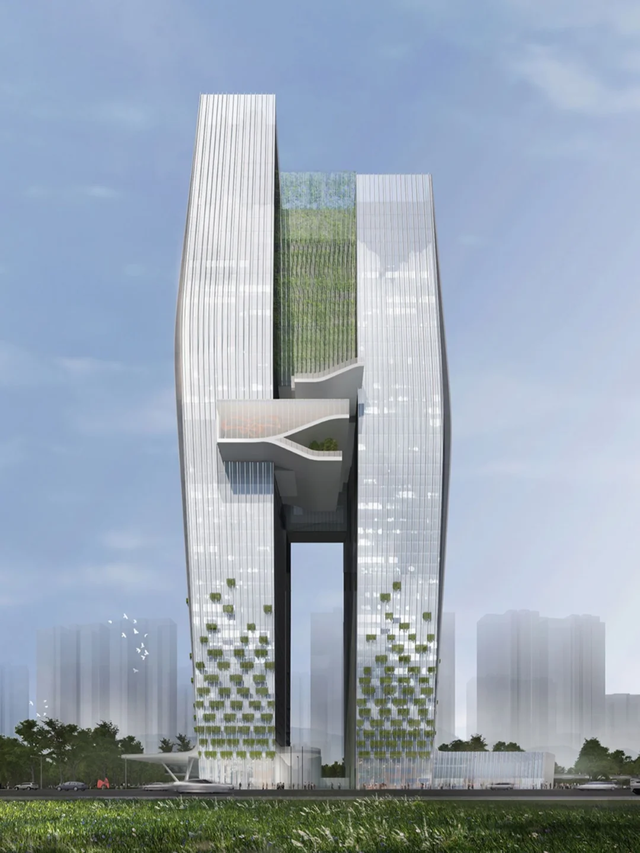 设计语言强调感性、生态与灵动,双塔并肩而立,气势恢宏。建筑顶部体量微微向外扩展,暗合“越高价值越大”的象征意味。