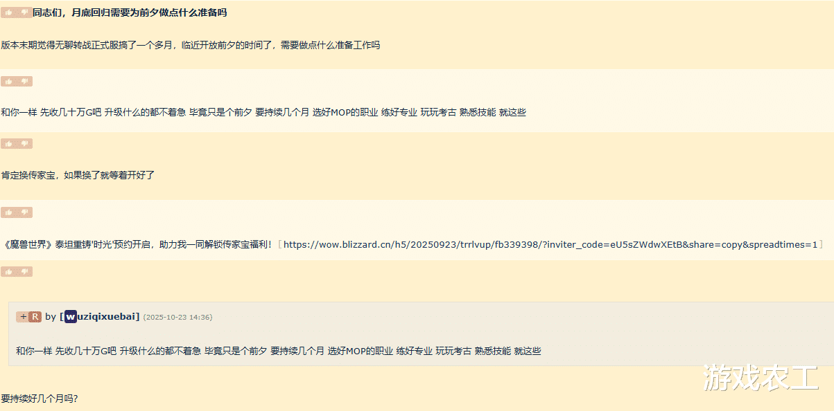 回到问题上来,临近开放前夕需要做什么准备工作?农工想说的是,如果是在魔兽世界WLK怀旧服末期转去正式服玩了一段时间,且只玩了一个月左右,那么现在回归根本不需要做任何准备工作,尤其是在你已经拿到了BIS装或者准BIS装的前提下,这个时候只要安心享受前夕的游戏体验即可。感觉无聊的时候可以继续转去正式服,毕竟真的没有什么装备需要收集了。