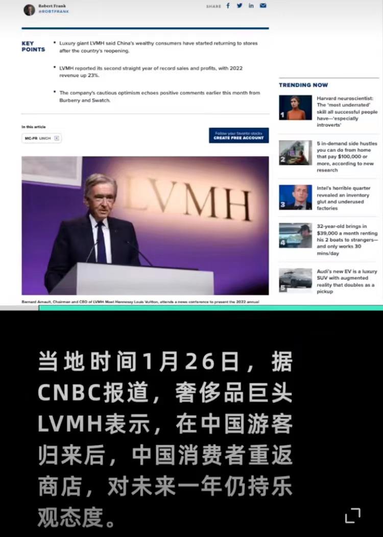 LVMH 的乐观态度呼应了Burberry 和Swatch 等其他奢侈品牌的积极评价。Burberry表示,在经历了艰难的12月之后,“中国正在显示出非常令人鼓舞的迹象”;Swatch则表示,“1月份在中国的销售增长,增强了集团对在2023年创造破纪录销售额的预期。”