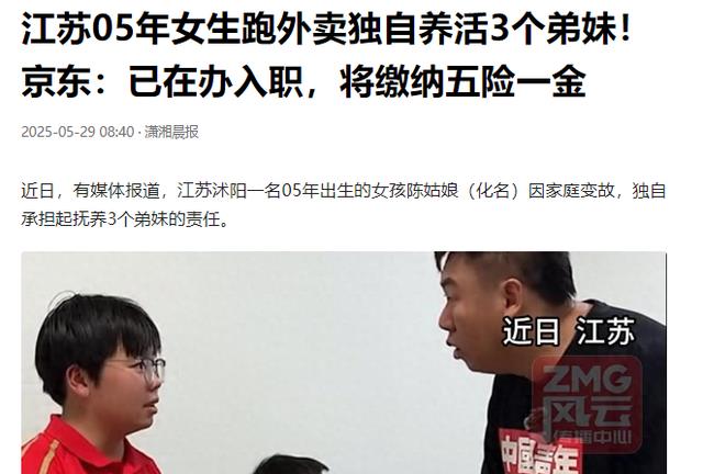 潇湘晨报 江苏05年女生跑外卖独自养活3个弟妹!京东:已在办入职,将缴纳五险一金2025-05-29