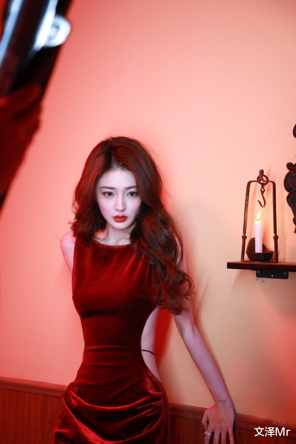 徐璐身着一袭酒红色吊带长裙倚门而立,大波浪黑发随风轻扬。她抬手撩发的瞬间,眼神流转间尽显万种风情。丝绒材质在暖红光下泛着珍珠般光泽,背部镂空设计巧妙展现蝴蝶骨,搭配红唇浓妆,仿佛从老电影走出的港风女神,媚而不俗。