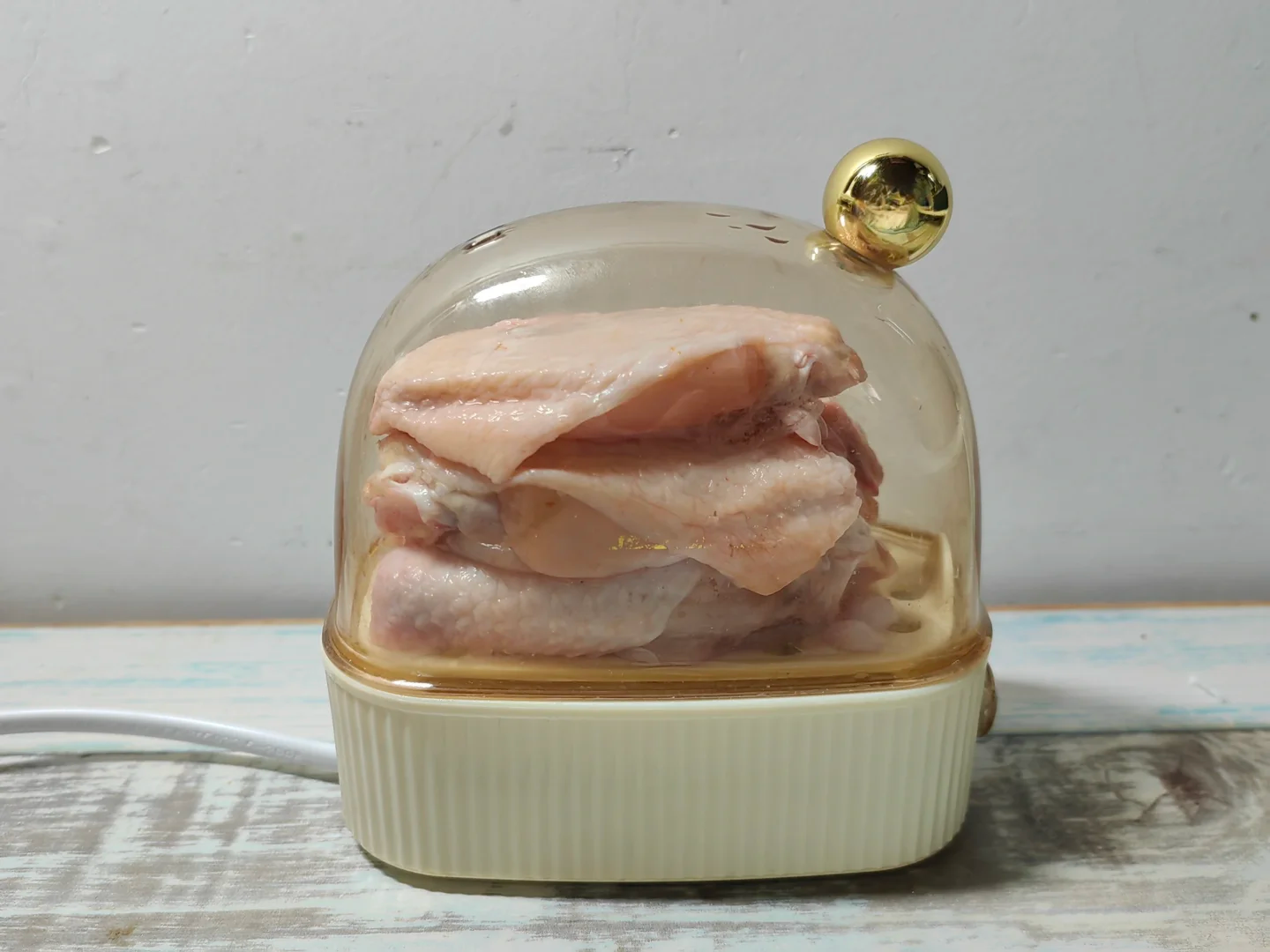 将鸡翅提前清洗干净,然后使用牙签在鸡翅表面戳几个孔,放入蒸蛋器当中,蒸25~30分钟左右。