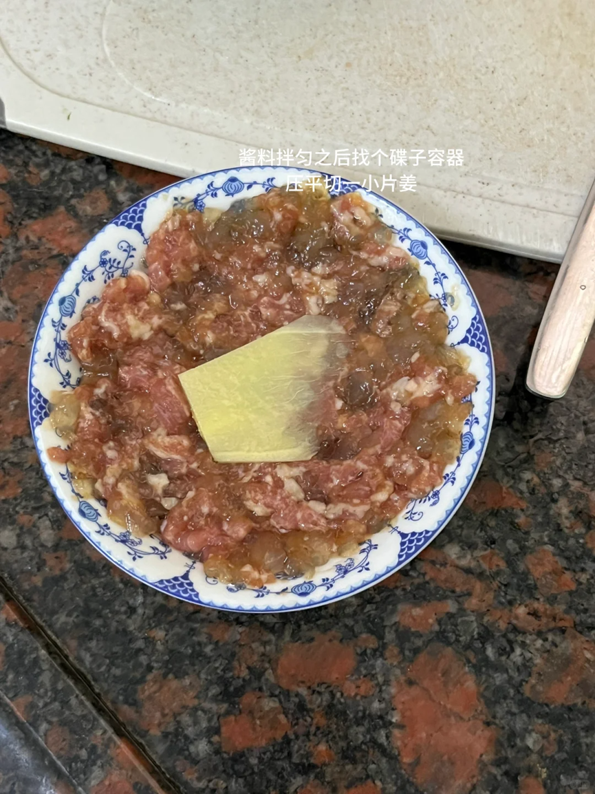 将猪肉馅儿、虾泥以及调料全部搅拌均匀之后,放入一个合适的容器当中压平,然后放入一小片的生姜。