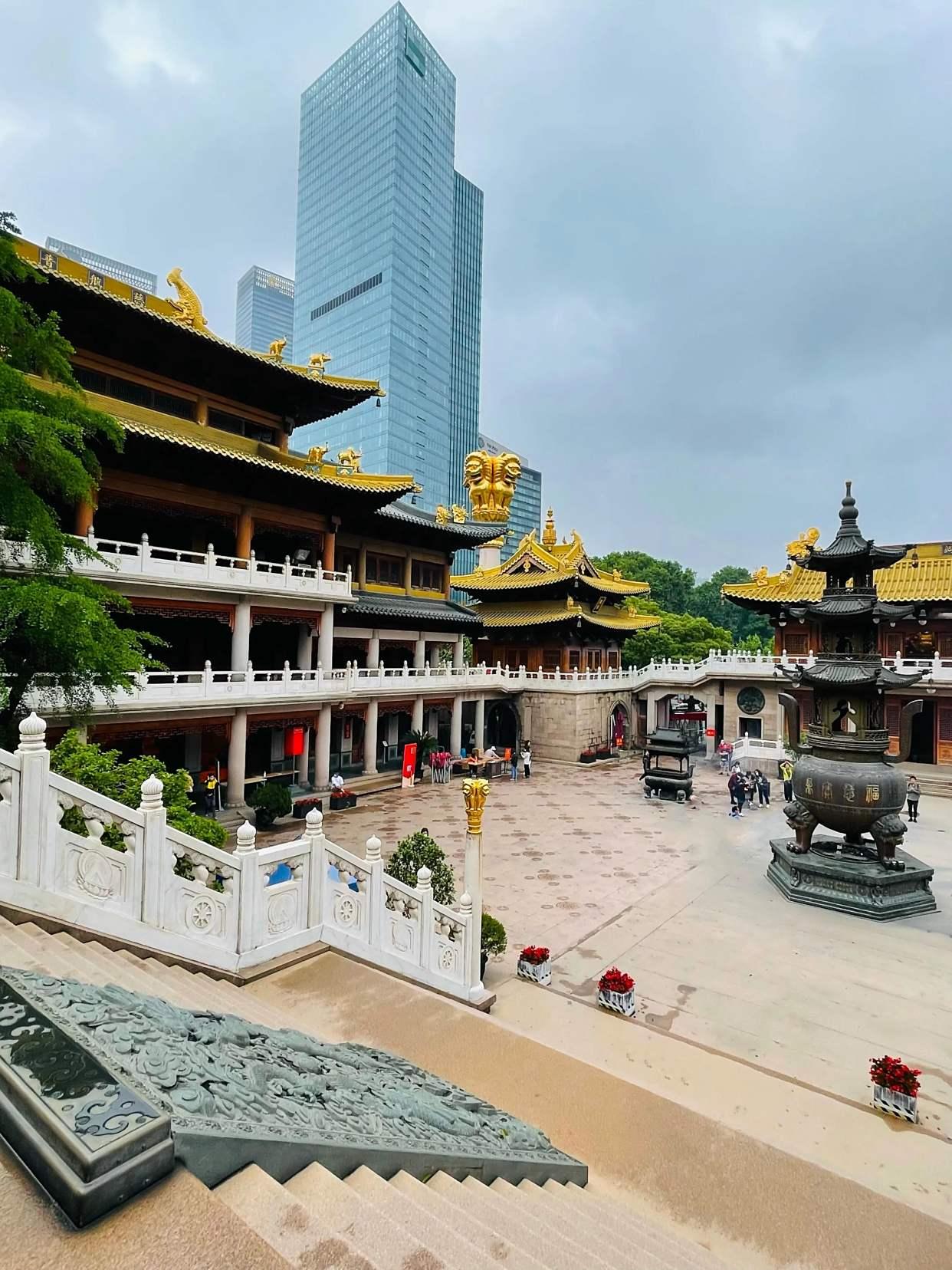 8. 上海静安寺:上海最古老的佛寺之一,寺内建筑宏伟,香火旺盛,建筑风格融合了传统与现代元素,能让人感受到佛教文化的博大精深和心灵的净化。
