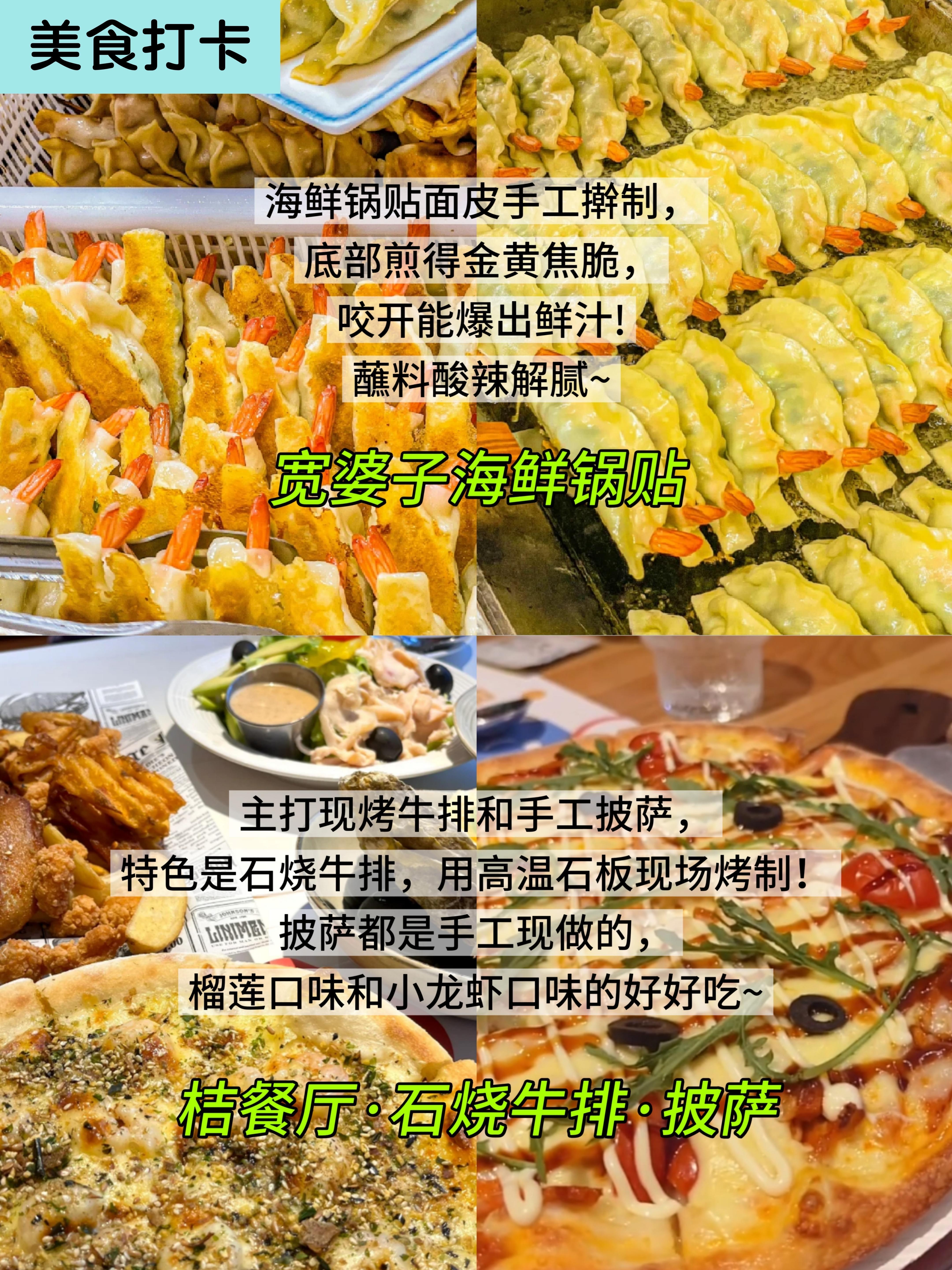 📍宽婆子海鲜锅贴:海鲜锅贴面🥟皮手工擀制,底部煎得金黄焦脆,咬开能爆出鲜汁!蘸料有小米辣醋汁和普通醋碟,酸辣解腻~