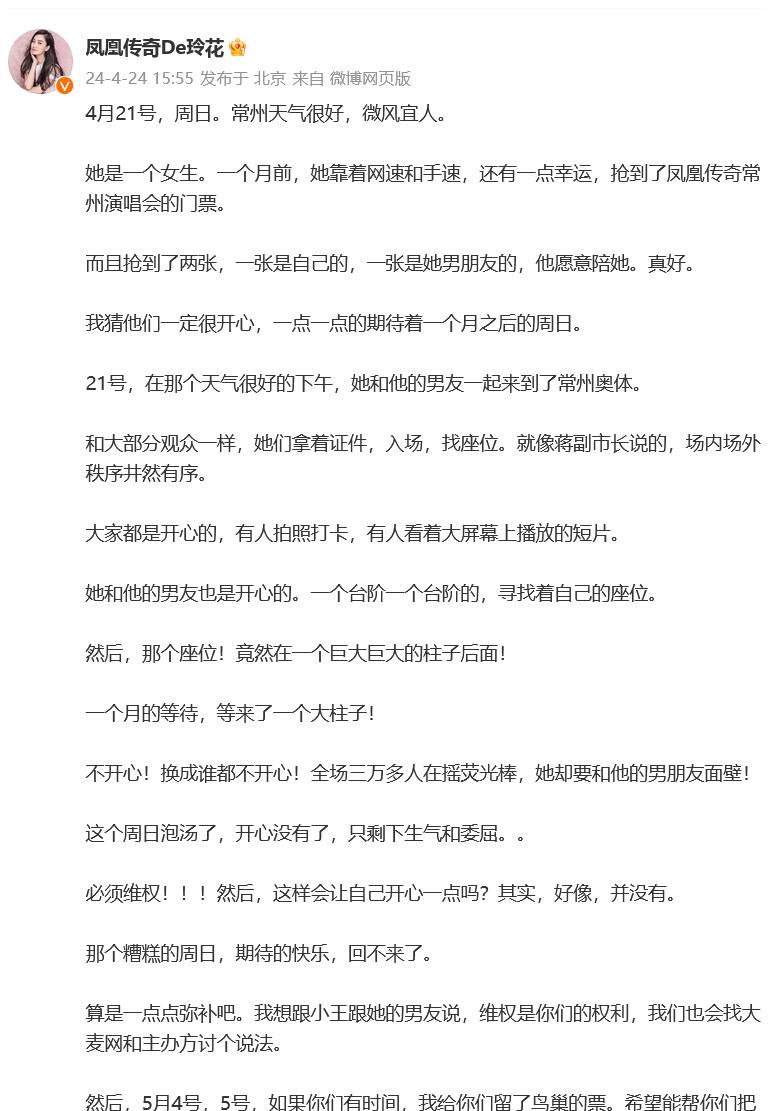 就在舆论将要进一步发酵之际,凤凰传奇主唱玲花及时发声,力挺粉丝维权。她在社交媒体上贴出一段长文,娓娓道来一名粉丝当天的失望心情,并承诺将为那些"柱子票"粉丝免费送出5月鸟巢演唱会的门票,希望能弥补他们的遗憾。