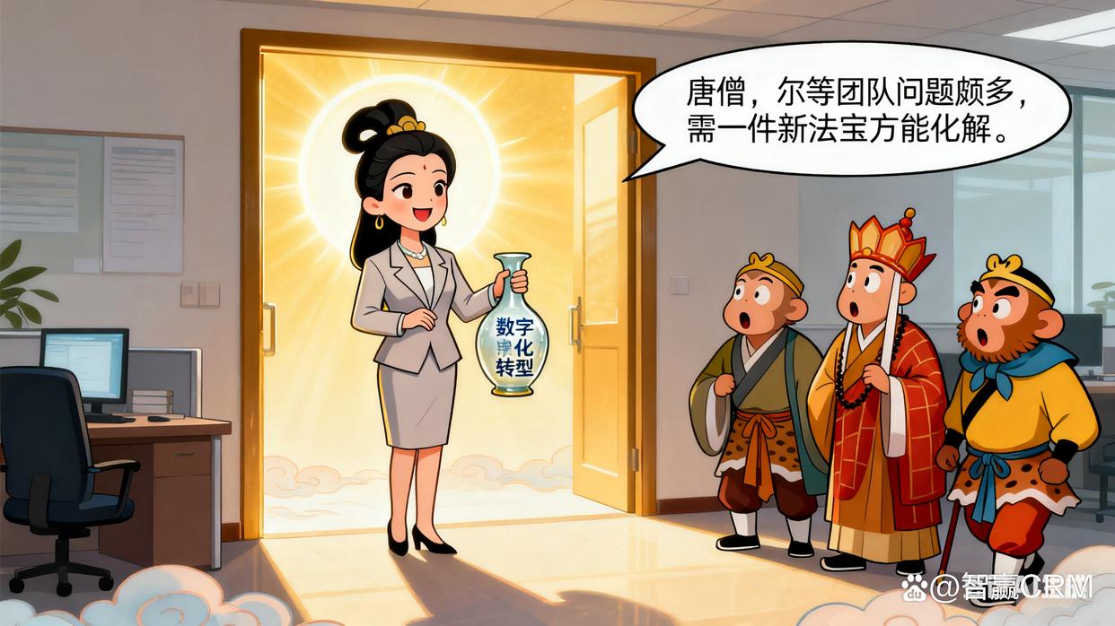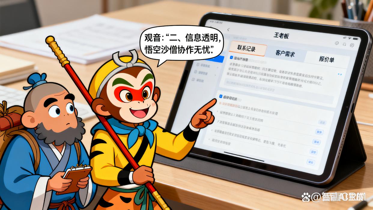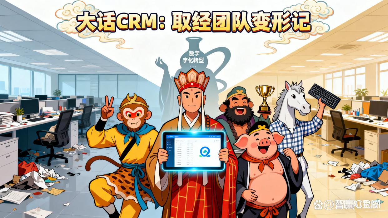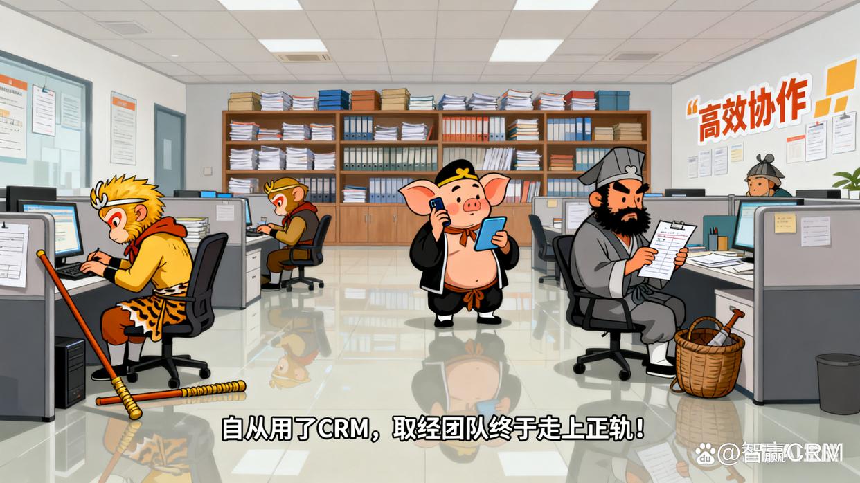 就在众人无措时,观音化身数字化顾问出现,带来了 CRM 系统。有了它,猪八戒再也不会忘跟进,孙悟空和沙和尚协作无忧,唐僧也能靠数据报表掌控全局。没过多久,取经团队彻底蜕变,办公室变得整洁有序,大家各司其职,最终顺利达成月度业绩,笑着拍下了大合影。