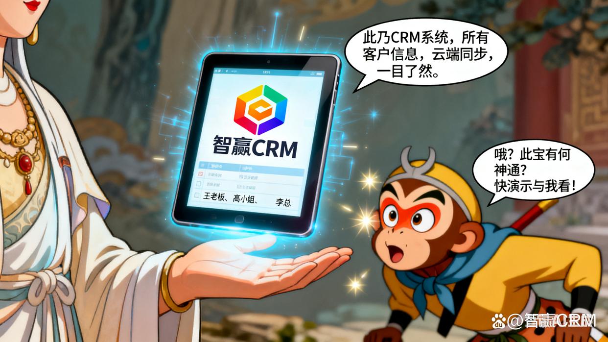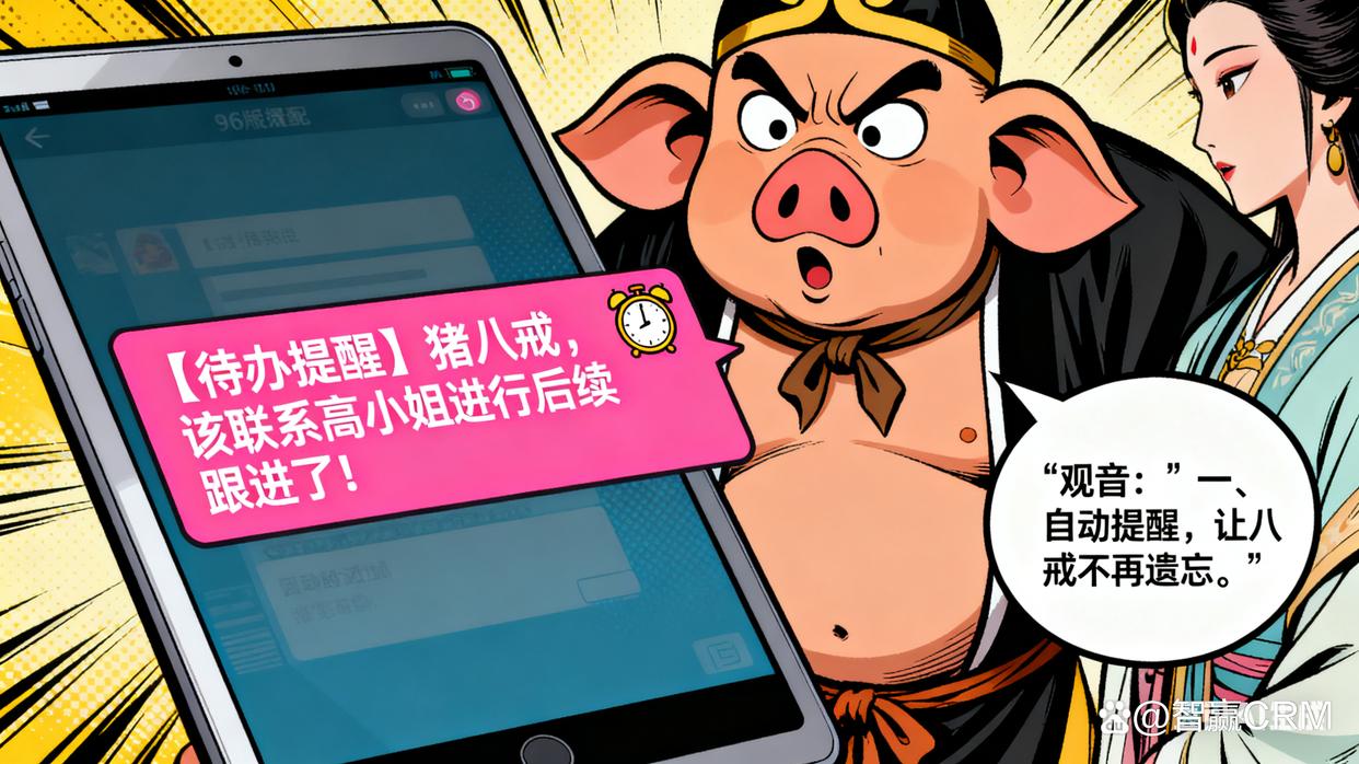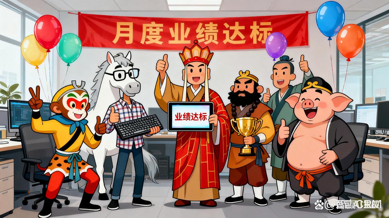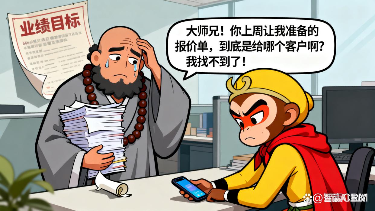 就在众人无措时,观音化身数字化顾问出现,带来了 CRM 系统。有了它,猪八戒再也不会忘跟进,孙悟空和沙和尚协作无忧,唐僧也能靠数据报表掌控全局。没过多久,取经团队彻底蜕变,办公室变得整洁有序,大家各司其职,最终顺利达成月度业绩,笑着拍下了大合影。