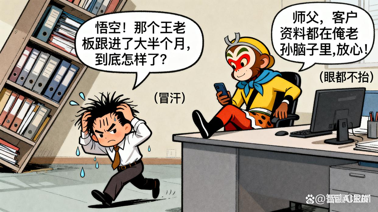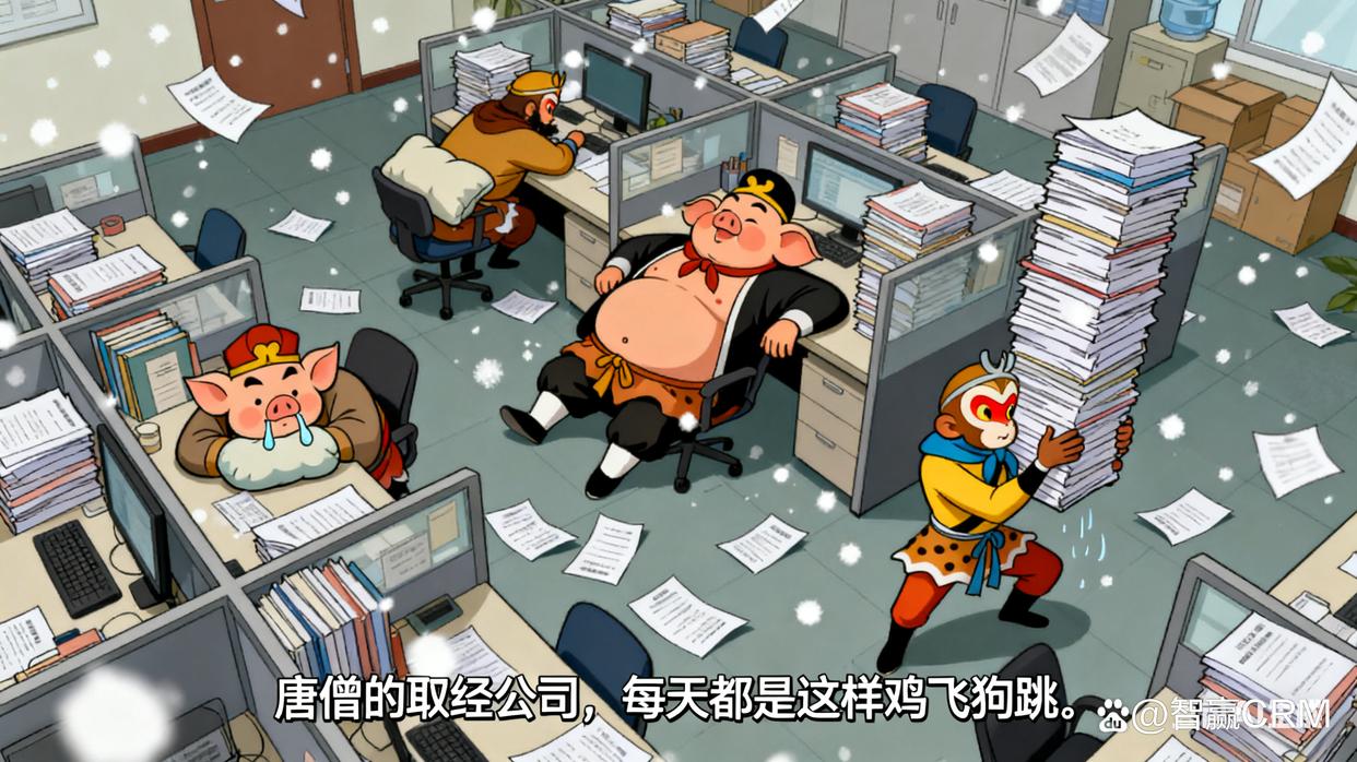 唐僧的取经公司曾是出了名的 “混乱现场”:办公室文件漫天飞,猪八戒四仰八叉趴在工位上梦会 “高小姐”,沙和尚抱着比人高的文件堆慌得冒冷汗,孙悟空把客户资料全记在脑子里,半点不着急。