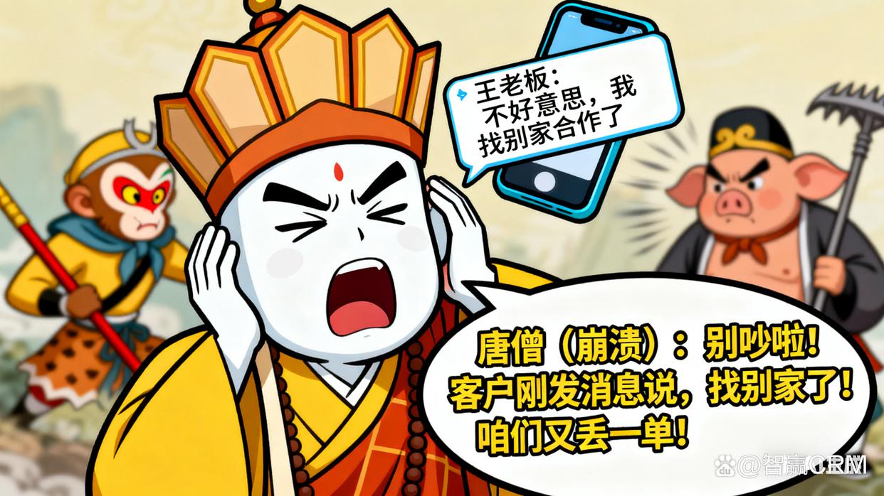 这天,唐僧追问王老板的跟进进展,孙悟空满不在乎,沙和尚却找不到关键报价单。偏偏猪八戒记着高小姐电话的便利贴被风扇吹飞,他急得半个身子探出去追。更糟的是,孙悟空和猪八戒还为抢客户吵得面红耳赤,没等分出胜负,唐僧就崩溃大喊 —— 王老板转投别家,又丢一单!
