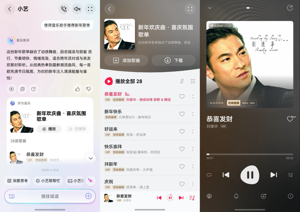说到体验,还可以直接唤醒小艺让音乐助手推荐一个新年歌单,从《恭喜发财》再到《好运来》等循环着听个遍,点亮空间音频按钮后,歌声中的鼓点和锣声仿佛从左右不同方向传来,“恭喜发财”的人声也更立体地环绕在耳边,热闹声场下好像自己真的被“爆金币”声音包裹,这才是属于年轻人的正向能量声音SPA。