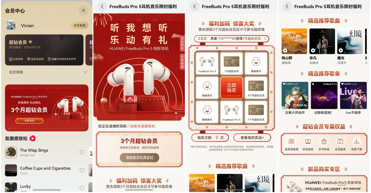 而且在1月31日前入手这副耳机,包装里会附送一张华为音乐权益卡,同时在华为音乐App里还能额外再领一个福利,前后加起来共四个月的华为音乐超钻会员。这个会员内容挺全,除了海量音乐和有声书,还能解锁全曲库的超高清音频、空间音频体验。