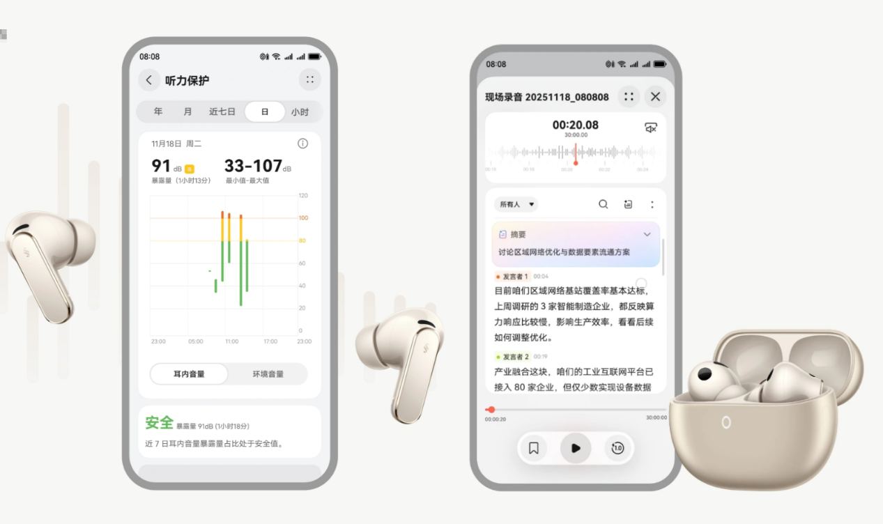 除了听歌,它在日常生活里也能帮上忙。比如内置的AI录音转写,开会或者访谈时打开,内容很快就能转成文字,整理起来省事不少。耳机还支持简单的听力健康检测,时不时给你一些听力状态反馈,提醒你好好保护耳朵。