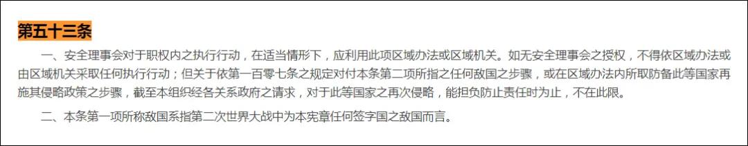 “敌国条款”,即《联合国宪章》第53条、第77条和第107条相关内容,规定德意日等法西斯或军国主义国家的任何一国有再次实施侵略政策的任何步骤,中法苏英美等联合国创始成员国有权对其直接实施军事行动,无须安理会授权。