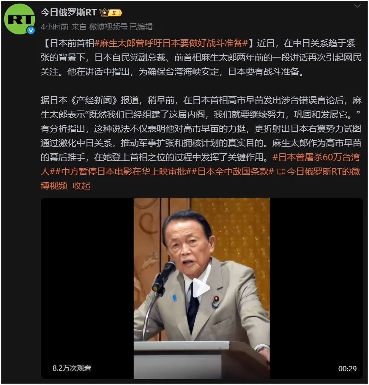 第四,日本前首相麻生太郎在两年前的讲话,也暴露了日本野心。其叫嚣“为确保台湾海峡安定,日本要有战斗准备。”
