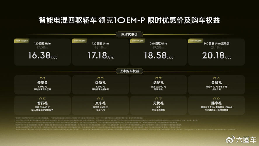 此外,领克10 EM-P还推出8重购车权益,用户在2025年9月8日至2025年10月31日期间完成领克10 EM-P大定锁单,且在2025年10月31日(含)前完成尾款支付及提车,即可享受上市限时专属权益。