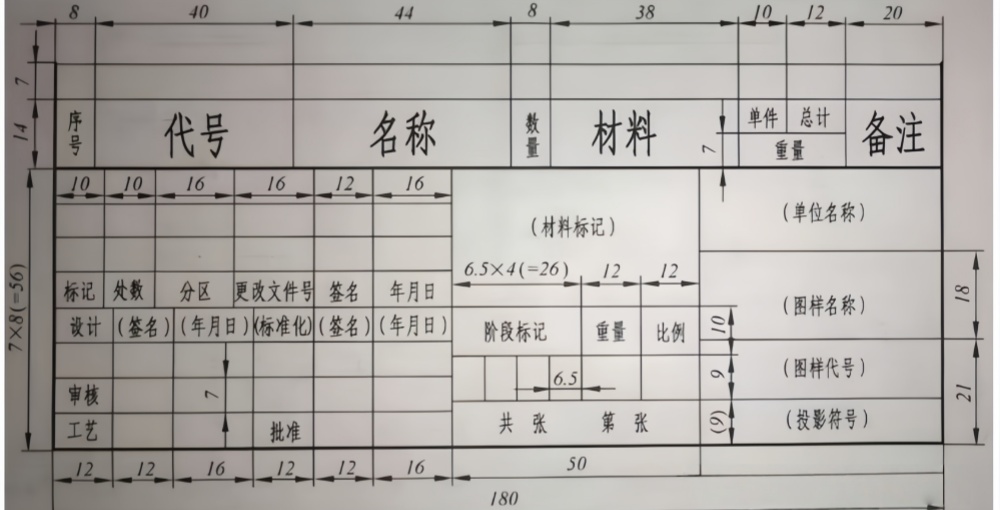标题栏的位置一般位于图纸的右下角,其长边置于水平方向并与图纸的长边平行,A4 图纸竖放,标题栏位于图纸正下方。从标题栏了解零件的名称、材料、比例、用途等信息。