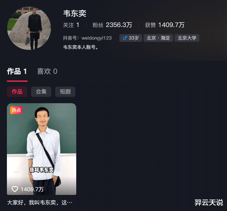 高考前一天,被誉为北大“韦神”的韦东奕突然在抖音发布了一条4秒钟自我介绍为主的视频,经网友发现和媒体转播后,截至本文发布,平台粉丝已超2356万。