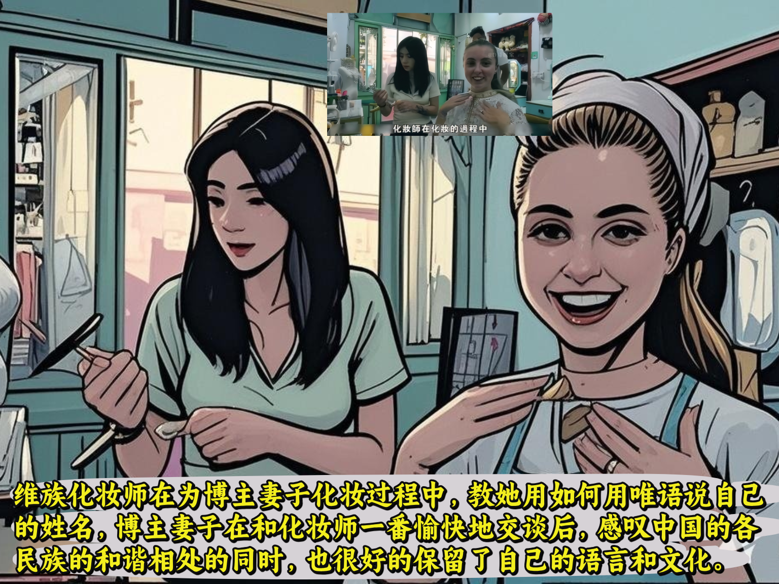 紧接着这场沉浸式的变装秀就正式开始了,博主妻子挑选完衣服以后,一位比他更像外国人的维族化妆师立马登场,在化妆的过程中还特意教了博主如何用维语说自己的姓名。