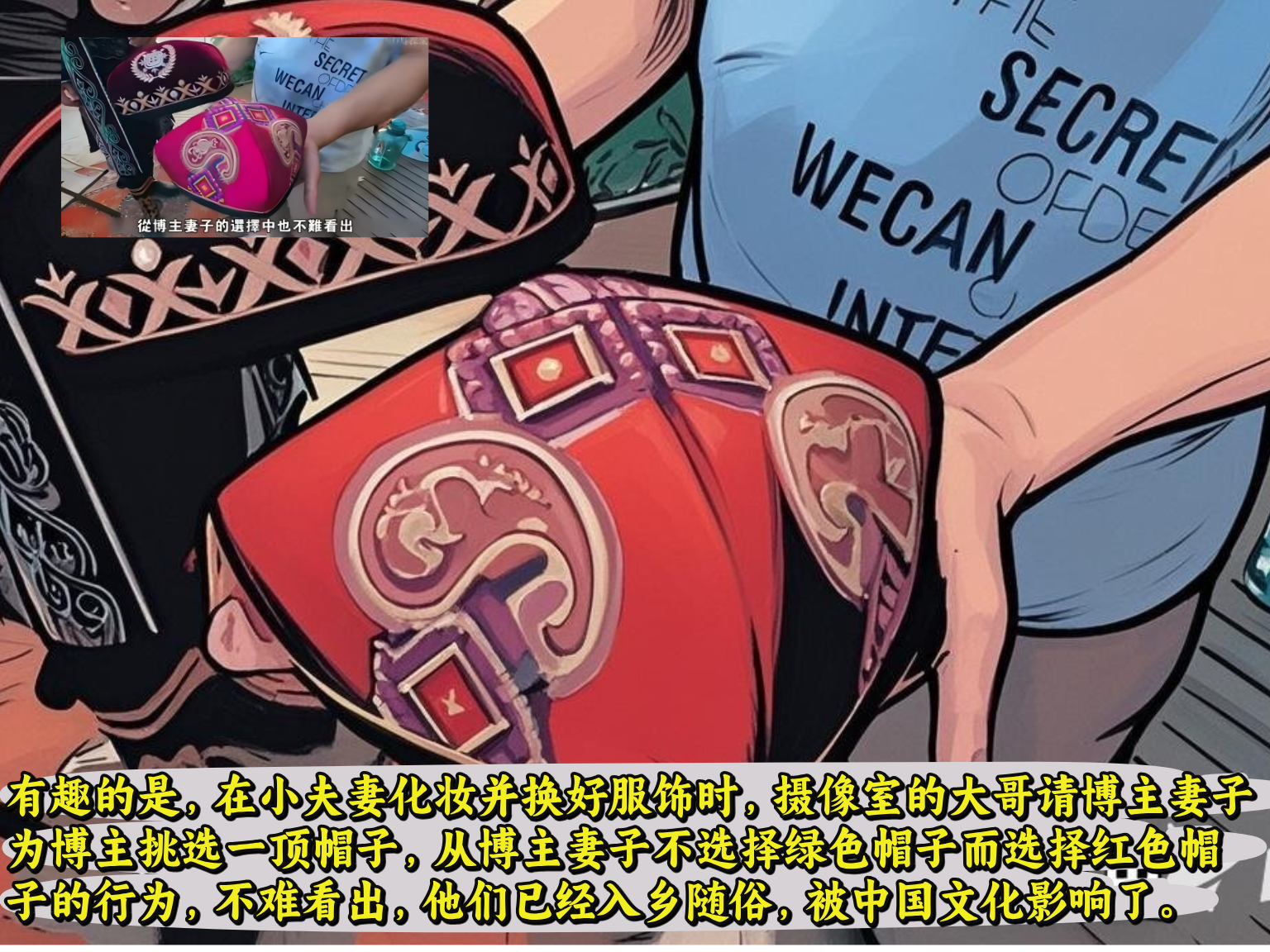 从博主妻子不选择绿色帽子的举动中也不难看出,她显然已经被“文化入侵”,不再觉得绿色帽子好看,而是为丈夫挑选了一顶红色的。
