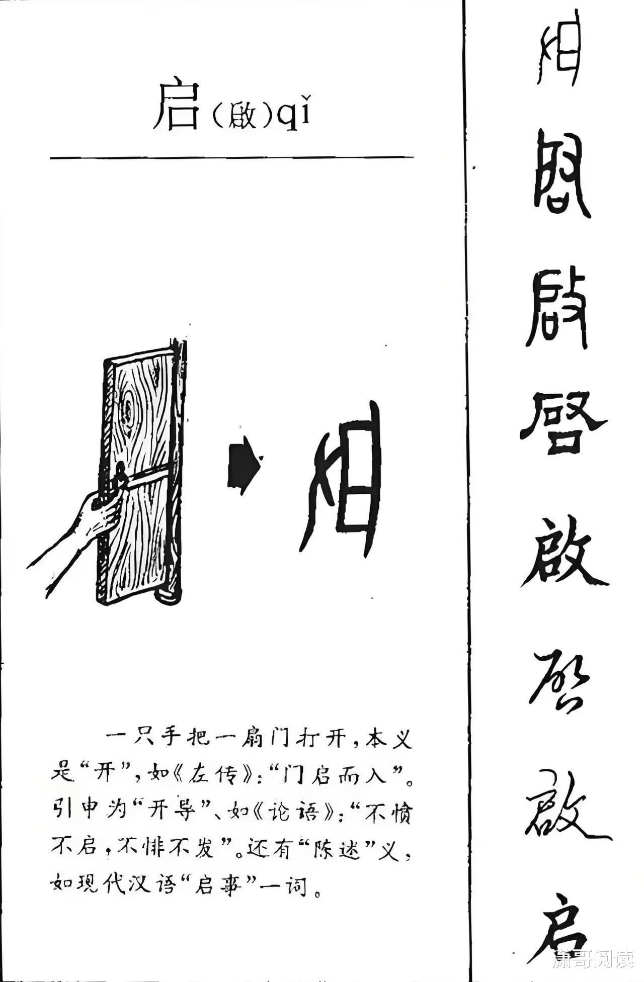 再来看“启”这个字,甲骨文里面的“启”字由“户”与“又”字组成,“户”就是门户,“又”代表的是手。意思就是说启的出生是因为有人为干预,这才有了“启”,这个“启”就有开启新生命、新时代的意思,或许是大禹的儿子“启”开创了夏朝。