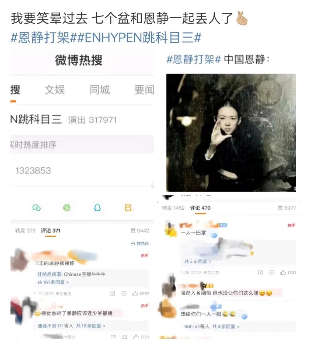 男团成员梁祯元与李羲承在舞台上注意到了台下的混乱,出言提醒注意秩序,却也没能阻拦这场闹剧,最后担架进场抬走冲突当事人,才让大战平息。这让围观路人们纷纷缺德:“七个盆(ENHYPEN的花名)和恩静一起丢人了”。
