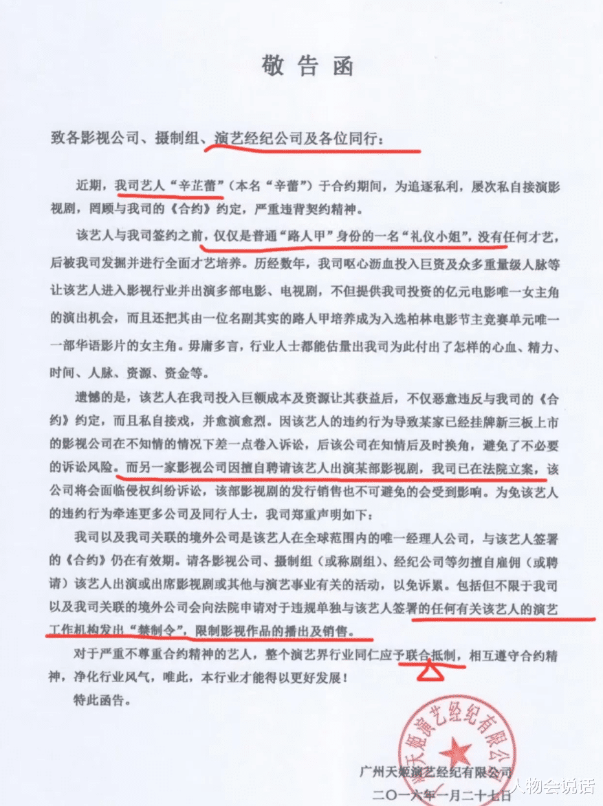 站在梁婷的角度来看,8年辛苦培养,为你倾尽所用。却换来辛芷蕾一朝被刺,转身就选了新的靠山。这或许任谁都接受不了,所以2016年,梁婷也没顾忌颜面,对辛芷蕾出了“杀招”。她用一张警告函,号召整个演艺界联手“抵制”辛芷蕾,亲自断掉辛芷蕾的演艺路。