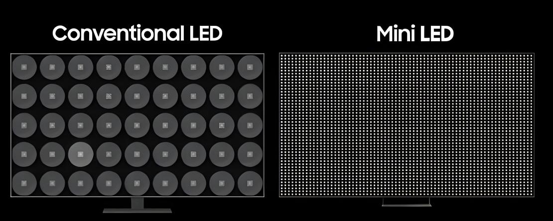 简单说,与传统液晶电视相比,Mini LED就是将背光源升级为成千上万颗微米级灯珠,然后分成数百甚至上千个独立控光分区。这就好比把普通的从大灯泡换成了可精确控制的聚光灯阵列,让该亮的地方亮,该暗的地方暗,可以大幅提升画面明暗表现力。