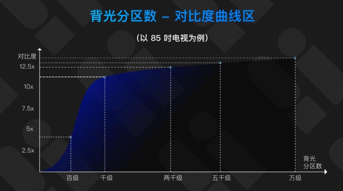 普通分区是通过增加分区数来提升对比度,而万象分区是通过更高效的控光系统性的提升对比度,前者对比度提升有边际递减效应的制约,当分区达到一定程度,即便是用较高的成本投入,画质也难大幅度提升。