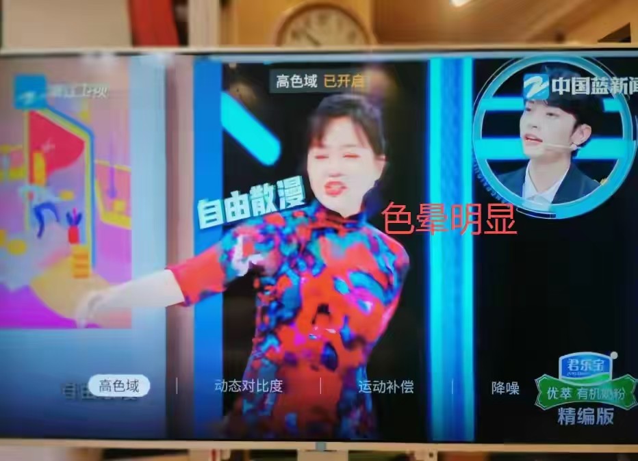 其实色域就像是调色盘里的颜色,种类多并不一定能画出一幅好画。如果颜色混杂控制不好,色彩就会相互串扰,或者出现偏色,画面依然会显得模糊不清。下图《王牌对王牌》也是我们家经常看的综艺节目,但是演员的妆造模糊,色彩偏差严重,看的累眼睛。