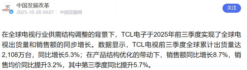 市场认可:双十一多款霸榜,众口难调也都能满足技术只是一方面,真切的体验和货真价实的认可,才是真的得到了市场认可。在刚刚结束的十一全周期,TCL电视以绝对优势登顶销量榜首。纵观全球市场,TCL同样表现亮眼,中国发展网就有报道称,2025年前三季度出货量达2108万台,稳居全球第二,Mini LED电视更登顶全球销量第一,国产的显示技术正在改写格局,让全球市场认可中国智造的含金量。