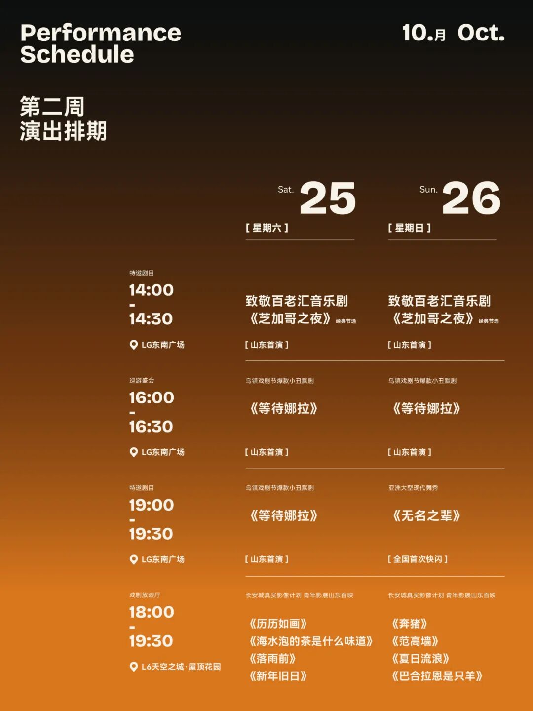 此外,还将带来亚洲大型现代舞秀全国首次快闪【无名之辈】;致敬百老汇经典音乐剧【芝加哥之夜】;乌镇戏剧节&阿那亚戏剧节爆款级山东首演剧目【艺奇客】赛博机车巡游,带来未来感机车沉浸戏剧体验,打造观众可参与、可互动、可传播的互动形式。
