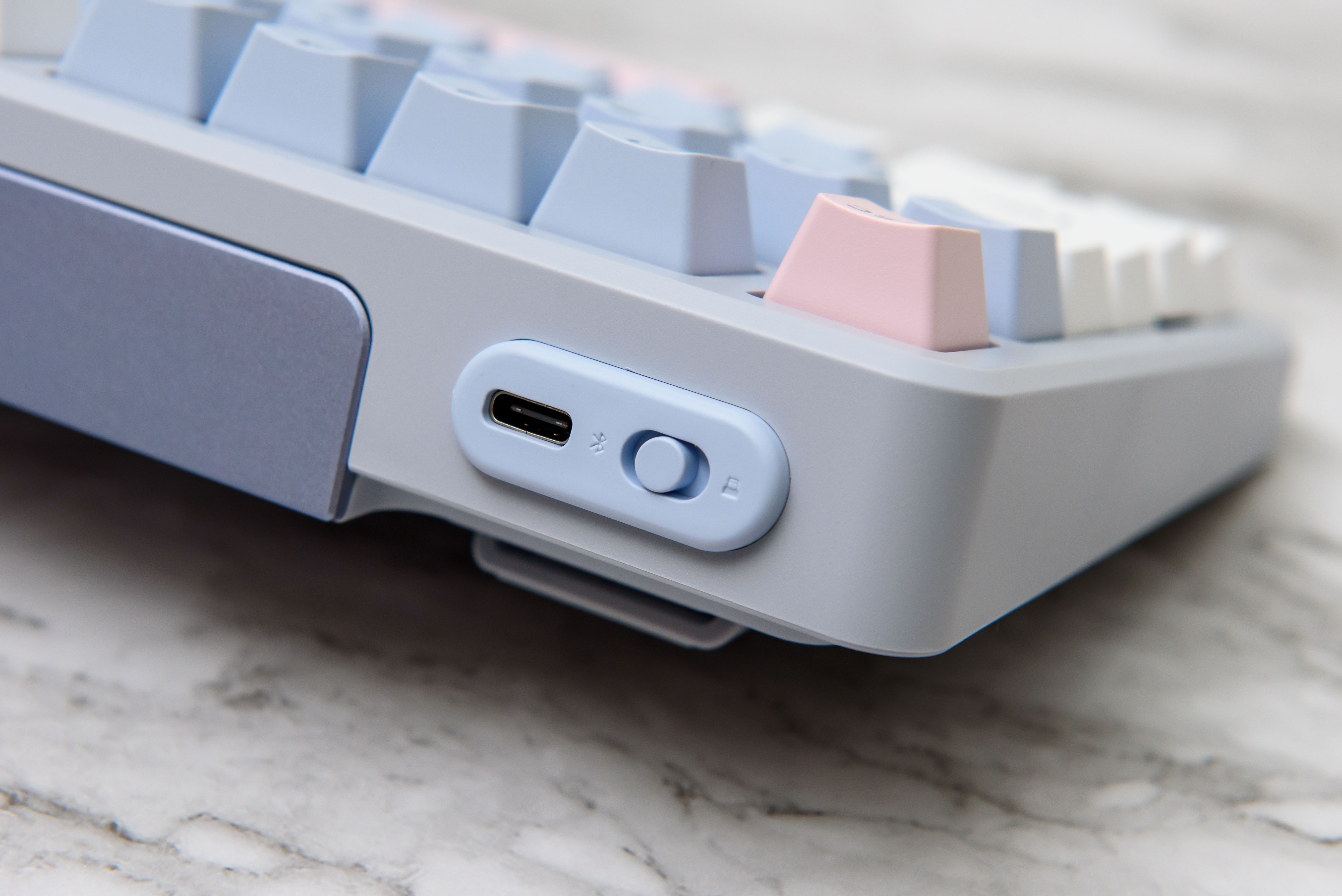 ▼键盘背部左上角为2.4G无线,有线连接及蓝牙连接三向拨杆。支持蓝牙5.0,无线2.4G及有线三模链接, 可以在5台设备间闪速切换且均支持全键无冲。键盘使用TYPE-C接口,键盘内置了一块10000mAh锂电池,在关闭所有灯光的情况下, 键盘可以达到1700小时的超强续航