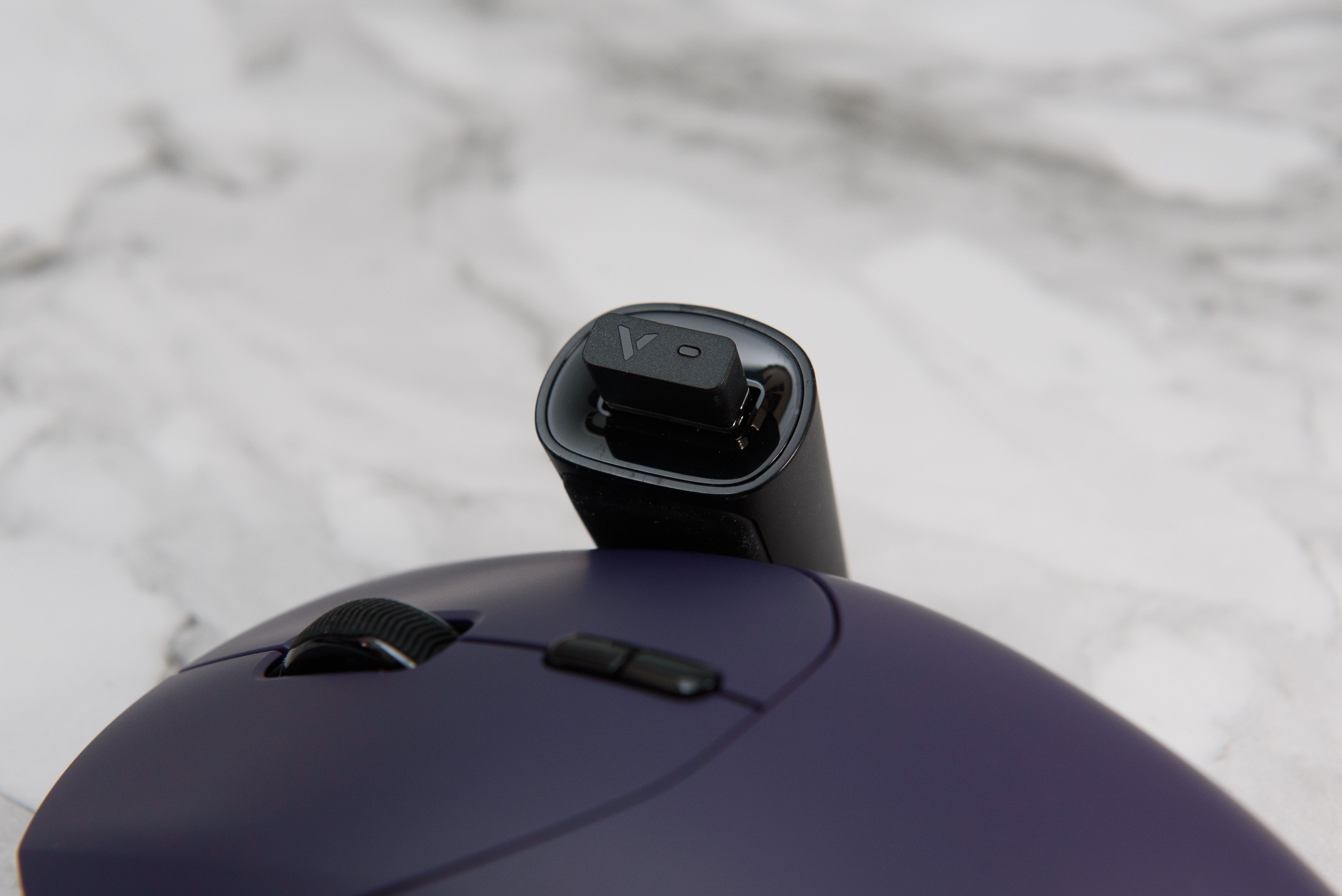 ▼鼠标搭配的Nano级8K接收器可以通过LED小灯实时显示电量,鼠标使用了V+Wireless2.0无线技术,抗干扰提升了30%