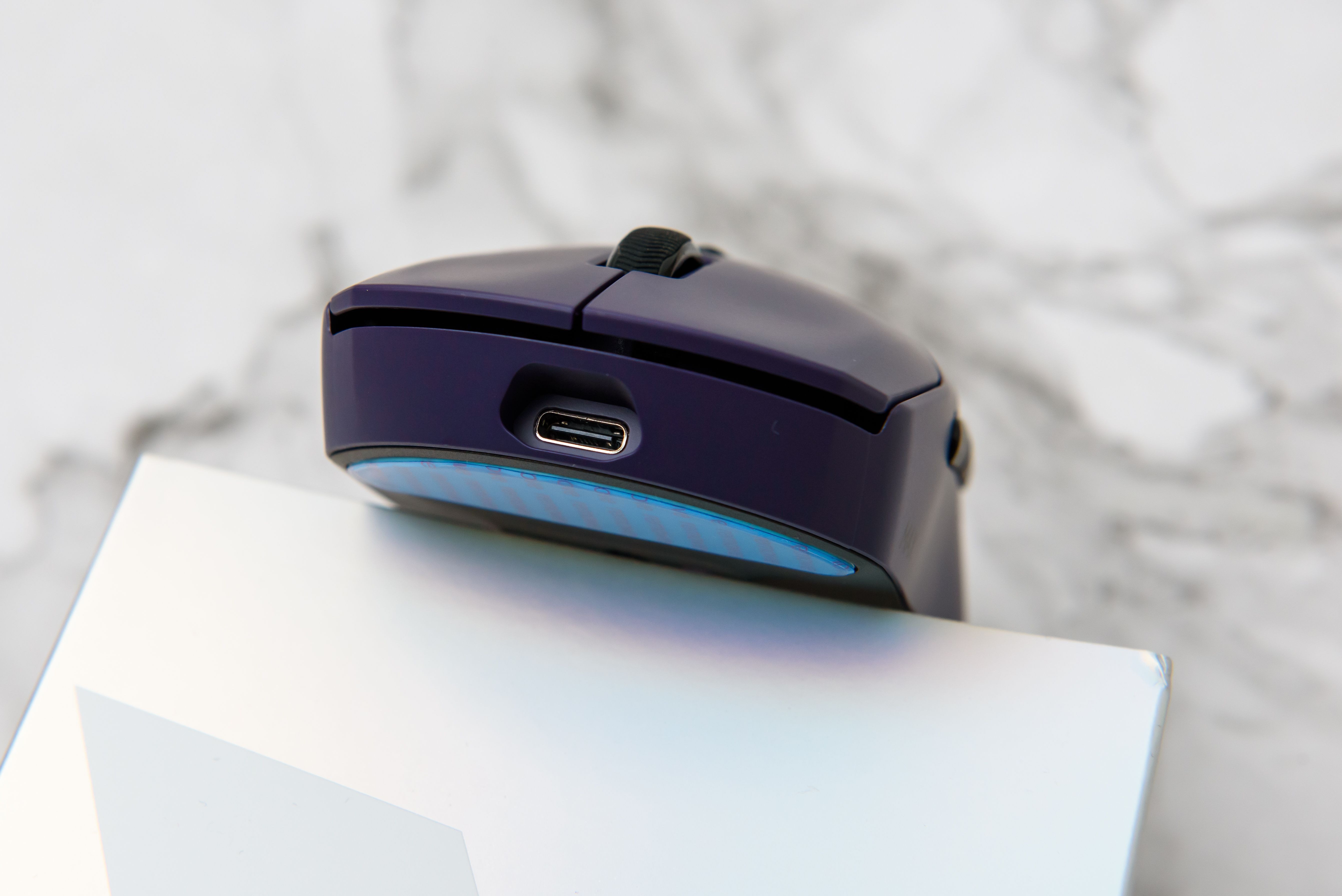 ▼鼠标顶部采用C口充电, 鼠标内置了800毫安时锂电池, 同样使用了NORDIC 54芯片, 配合雷柏的Power+(代号:炎龙)的固件技术, “8828”电竞鼠标跟手丝滑新标准,原生双8K回报率、8K按键扫描率、超2万帧全段静态按键扫描率, 并开放了4档(1000Hz/2000Hz/4000Hz/8000Hz)按键扫描率,鼠标在有线模式下全链路按键最快速度≤0.155ms, 无线模式下全链路按键最快速度≤0.225ms, 鼠标响应更积极。在标准的1K回报率下续航可达750小时,即使8K回报率性能全开的情况下,续航也可以达到120小时