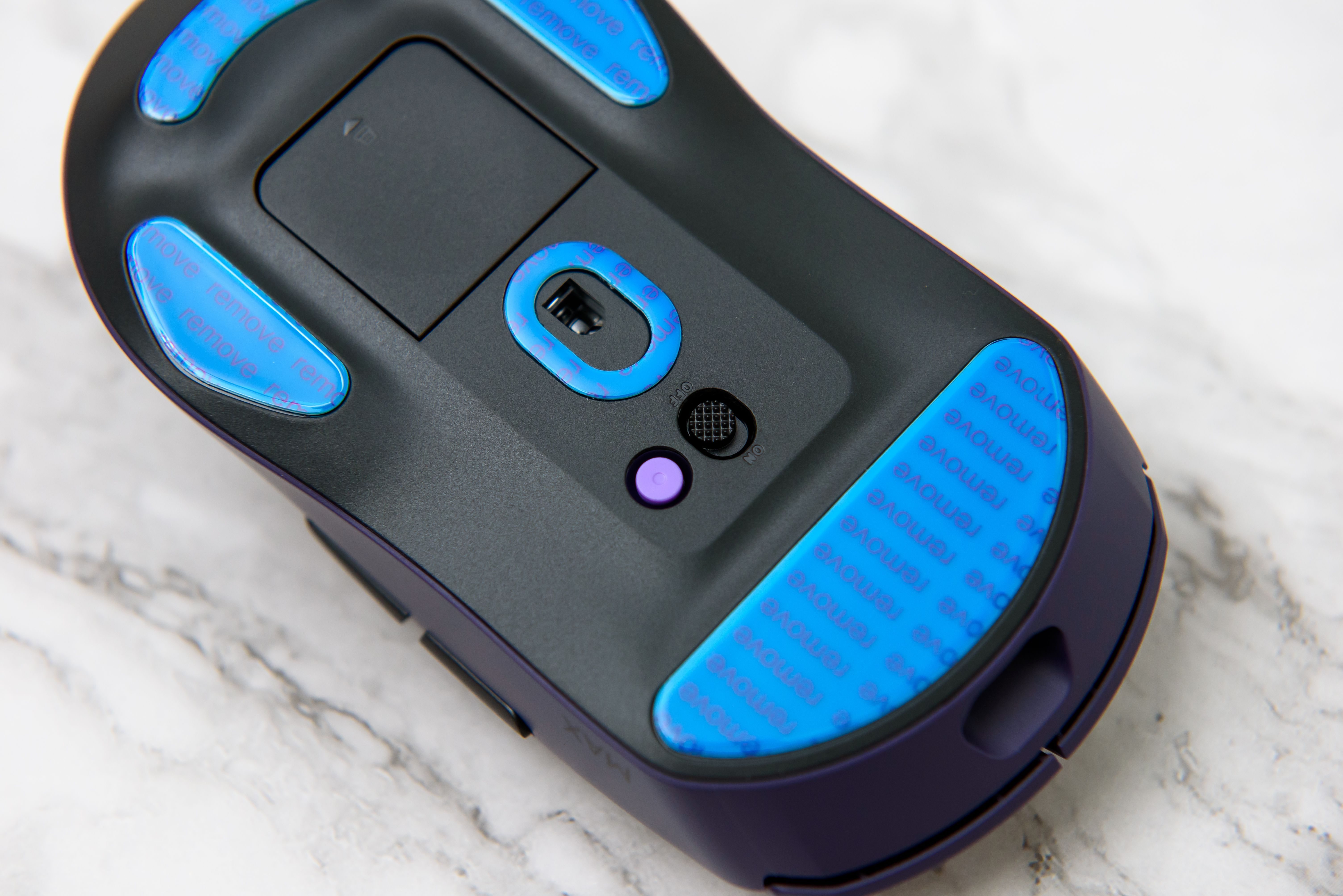 ▼ 鼠标底部使用了大块的铁氟龙含量99.95%的冰感脚贴,鼠标中前部为电源开关和可以自定义的DIY按键,传感器采用了原相定制3950 Ultimate传感器, 支持10-45000DPI范围内调节,支持0.7-1.7mm范围内11档静默高度调节,支持玻璃追踪技术,拥有≥20000FPS静态疾速扫描的狂暴模式. 给玩家指哪打哪的电竞级体验