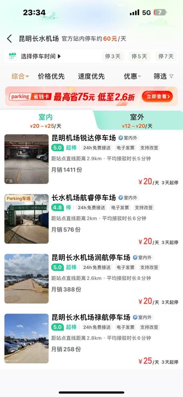 昆明机场位置虽偏,但自驾前往优势显著:旅客可自由规划时间,避免换乘烦恼,既省时又省钱,使旅程更顺畅。但机场停车费一直令人诟病,室内停车24小时最高收费60元,室外也要40元,对短暂停留者而言是个负担。幸运的是,现在有了更省钱的选择:可以通过【小强停车】查看机场周边的停车场,附近有的停车场每天的费用甚至低至12元。相较于官方停车场附近停车场还是会更加便宜!