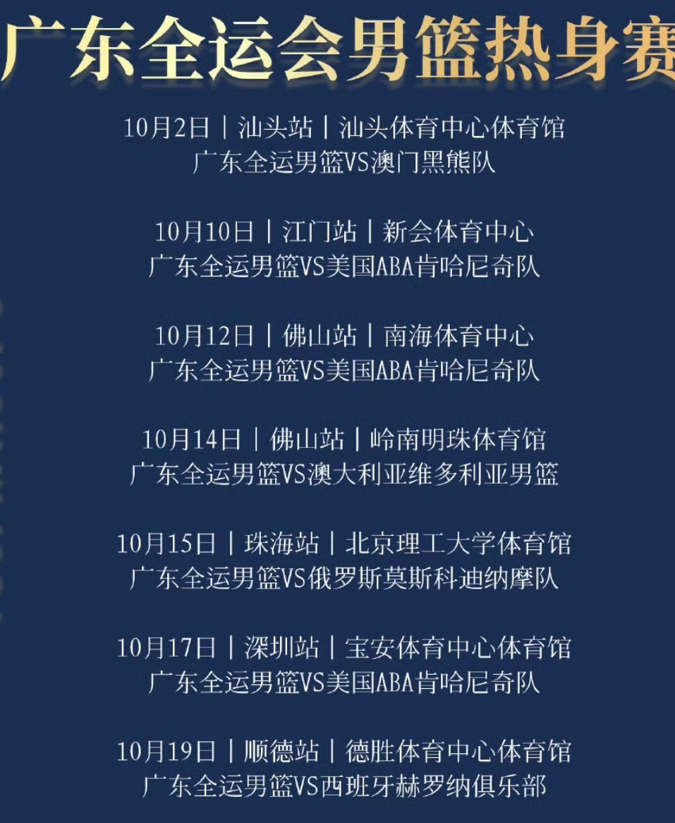 先来看这7场比赛的具体时间和对手,10月2号 汕头站,对手是澳门黑熊队,10月10号 江门新会站,对手是美国肯尼哈奇队,10月12号 佛山南海站,对手依然是肯尼哈奇。10月14号 佛山禅城站,对手是澳门维多利亚队,10月15号 珠海站,对手是俄罗斯莫斯科迪纳摩队。10月17号 深圳宝安站,对手是美国肯尼哈奇队,10月19号 佛山顺德站,对手是西班牙赫罗纳男篮俱乐部,10月21号 深圳龙华站,对手是西班牙赫罗纳俱乐部。以上就是广东男篮10月份暂时确定的7场热身赛,从国内球队到美国球队再到欧洲球队,广东男篮碰了一个遍。