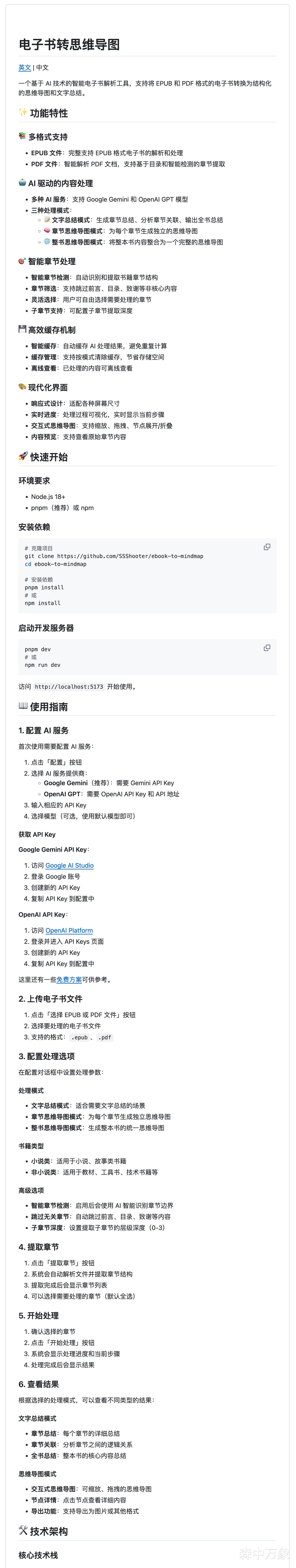 ebook-to-mindmap 是一个基于 AI 技术的智能电子书解析工具,它可以将 EPUB 或 PDF 格式的电子书转化为结构化内容(章节摘要 +内容关联)并生成交互式思维导图,以帮助读者快速理解书籍的结构与核心内容。