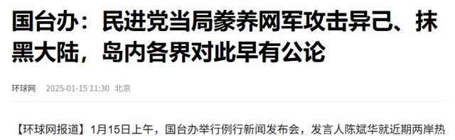 环球网2025-01-15——国台办:民进党当局豢养网军攻击异己、抹黑大陆,岛内各界对此早有公论