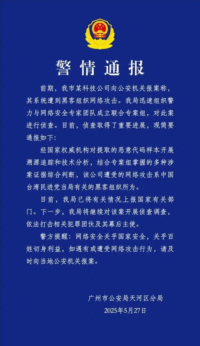 广州市公安局天河区分局发布警情通报,确认广州一家科技公司遭受的网络攻击的背后“黑手”。