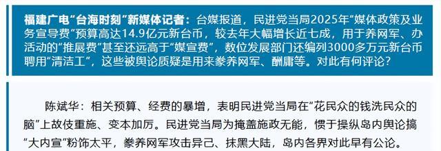 陈斌华表示民进党当局为了掩盖施政无能,习惯操纵岛内舆论搞“大内宣”,豢养网军攻击异己、抹黑大陆,岛内各界对此早有公论。