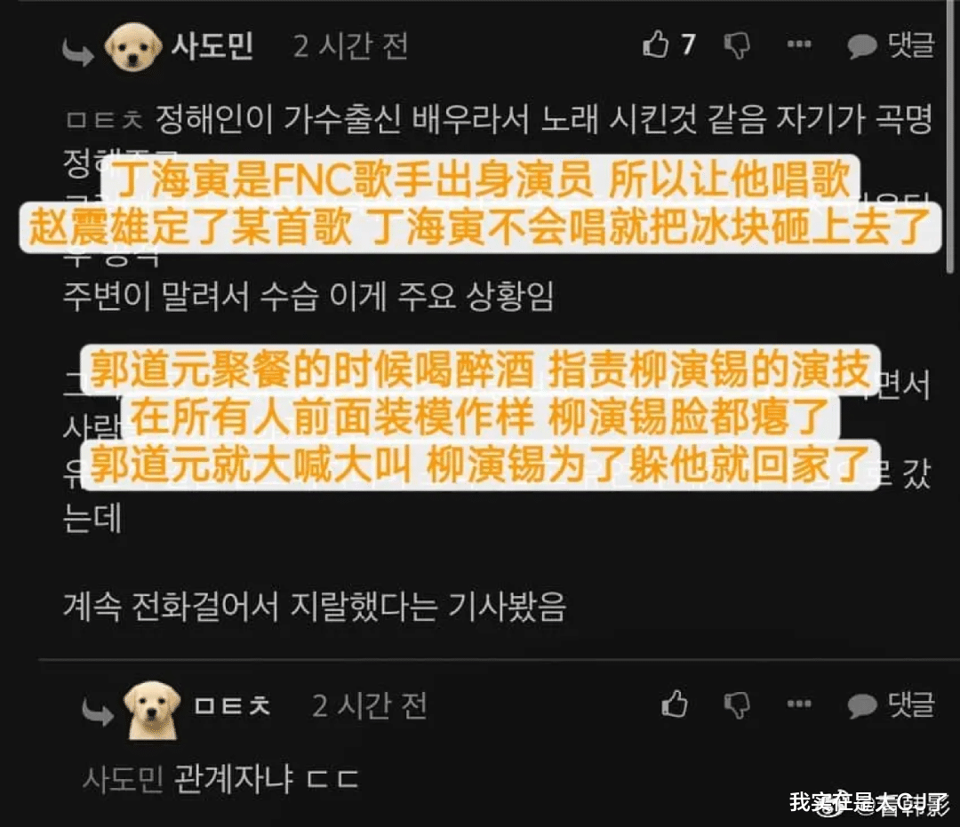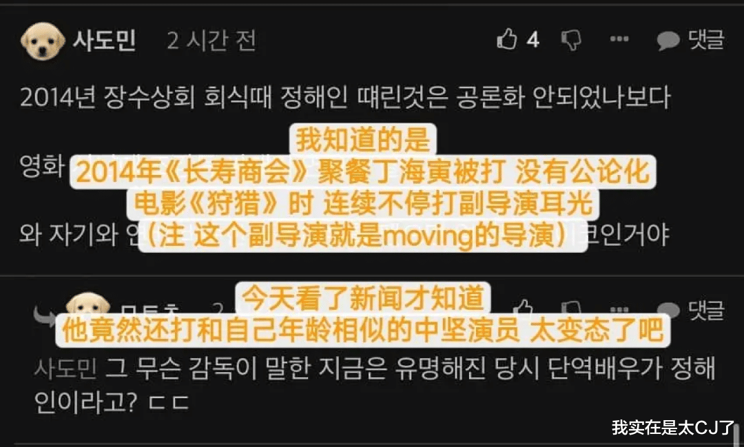 韩国网友此时又一次发挥神通,爆料赵震雄扔冰块的新人演员是丁海寅,两人曾在2014年合作过电影《长寿商会》。